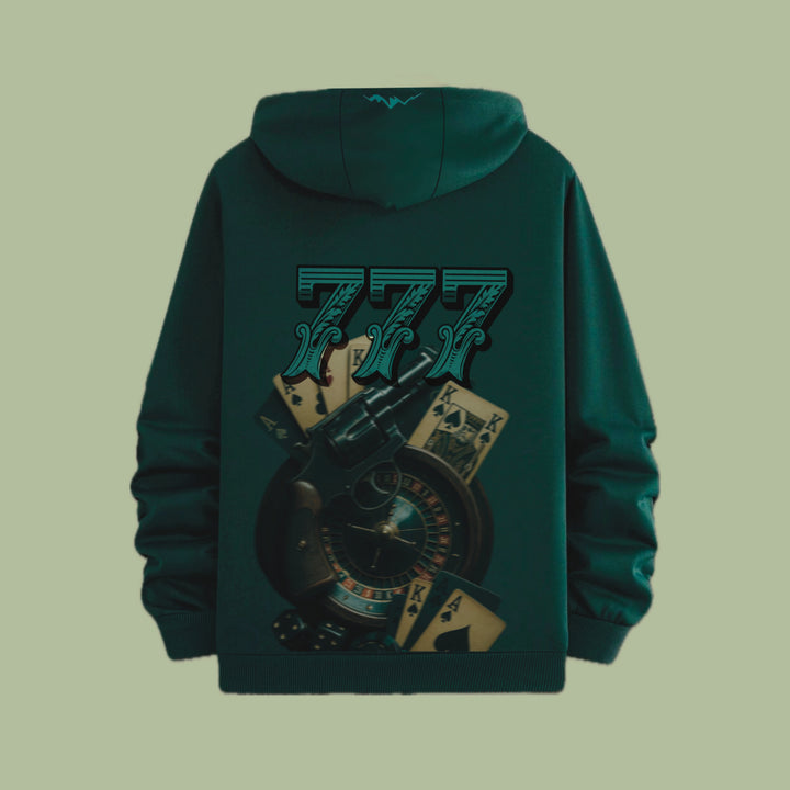 "The High Roller" Hoodie is for the individual who understands that life is the ultimate high-stakes game. The back of this premium emerald green hoodie features a rich tableau of risk and power. The spin of the roulette wheel, the fall of the dice, and the high cards dealt represent the calculated chances you take, while the revolver is a stark reminder that you always control the outcome.