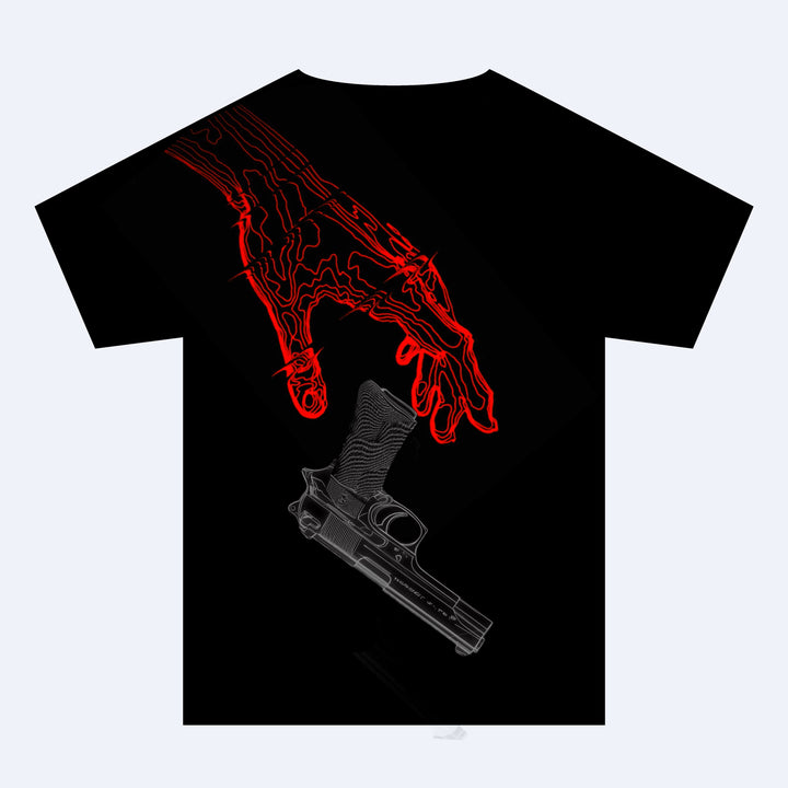 "The Reach" tee captures the critical moment where intention becomes action. Featured on the back, a hand rendered in our signature red topographic contours—a complex map of influence and ambition—reaches for the cold, calculated authority of a firearm. This isn't just a graphic; it's a narrative of the decision to seize control and shape your own destiny.