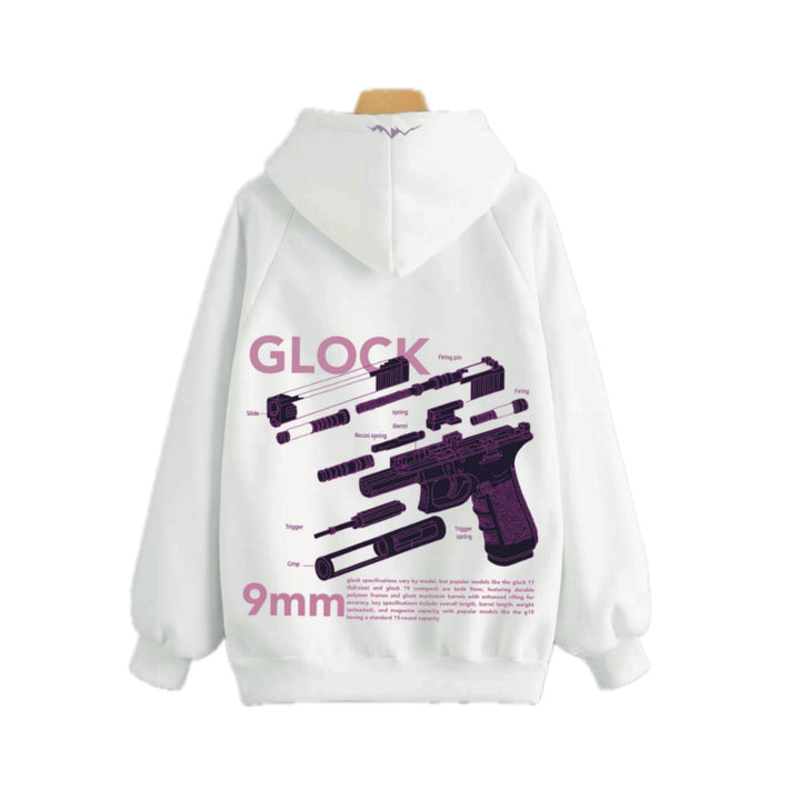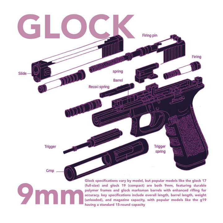 Intricate Back Graphic: A large, detailed schematic of a Glock 9mm showcases the inner workings of power and precision.